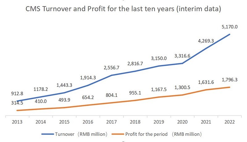According to CMS’ 2022 interim report, the turnover was RMB4,447.8 million (H1 2021: RMB3,843.0 million), representing an increase of 15.7% over the same period last year; in the case that all medicines were directly sold by the Group, the turnover would increase by 21.1% to RMB5,170.0 million (H1 2021: RMB4,269.3 million). Profit for the period was RMB1,796.3 million (H1 2021: RMB1,631.6 million), representing an increase of 10.1% over the same period last year. CMS's turnover and profit for the previous ten interim periods have maintained a sound growth momentum with both CAGR exceeding 20%.