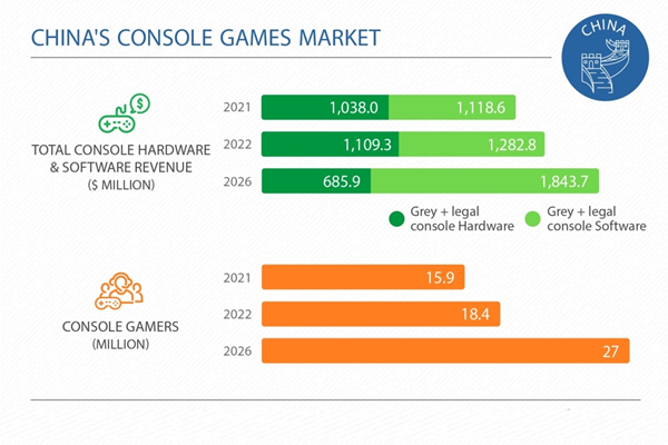 China's console market size was $2.16 billion in 2021, up 16.7% YoY, and is projected to reach $2.53 billion in 2026, including China's legal versions and grey market imports of hardware and software