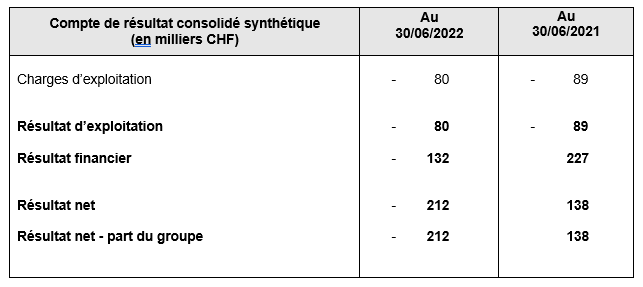 Le résultat d’exploitation ressort à – 80 KCHF contre – 89 KCHF sur la même période en 2021 et se compose de charges de gestion pour 42 KCHF (30 juin 2021 : 53 KCHF), de charges de fonctionnement pour 12 KCHF (30 juin 2021 : 14 KCHF) et 26 KCHF de charges d’impôts (30 juin 2021 : 22 KCHF).