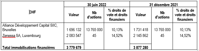 Au cours du premier semestre 2022, Ci Com SA a conservé ses participations dont la valorisation à la clôture de la présente période ressort à 3 780 KCHF contre 3 877 KCHF à la clôture précédente (Cf. paragraphe Participations Financières ci-après).