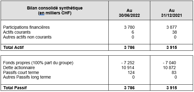 Les fonds propres du groupe s’élèvent au 30 juin 2022 à – 7 252 KCHF (31 décembre 2021 : - 7 040 KCHF).