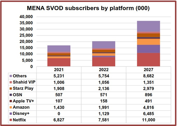 MENA will have 36.70 million SVOD subscriptions by 2027. Netflix will account for 30% of this total. Disney+ will start in the Arabic countries, Israel and Turkey in 2022 - quickly growing to 6.5 million subscribers by 2027. Regional player StarzPlay will have 2.98 million subscribers [excluding its operation in Pakistan] by 2027 - 1 million more than in 2021.