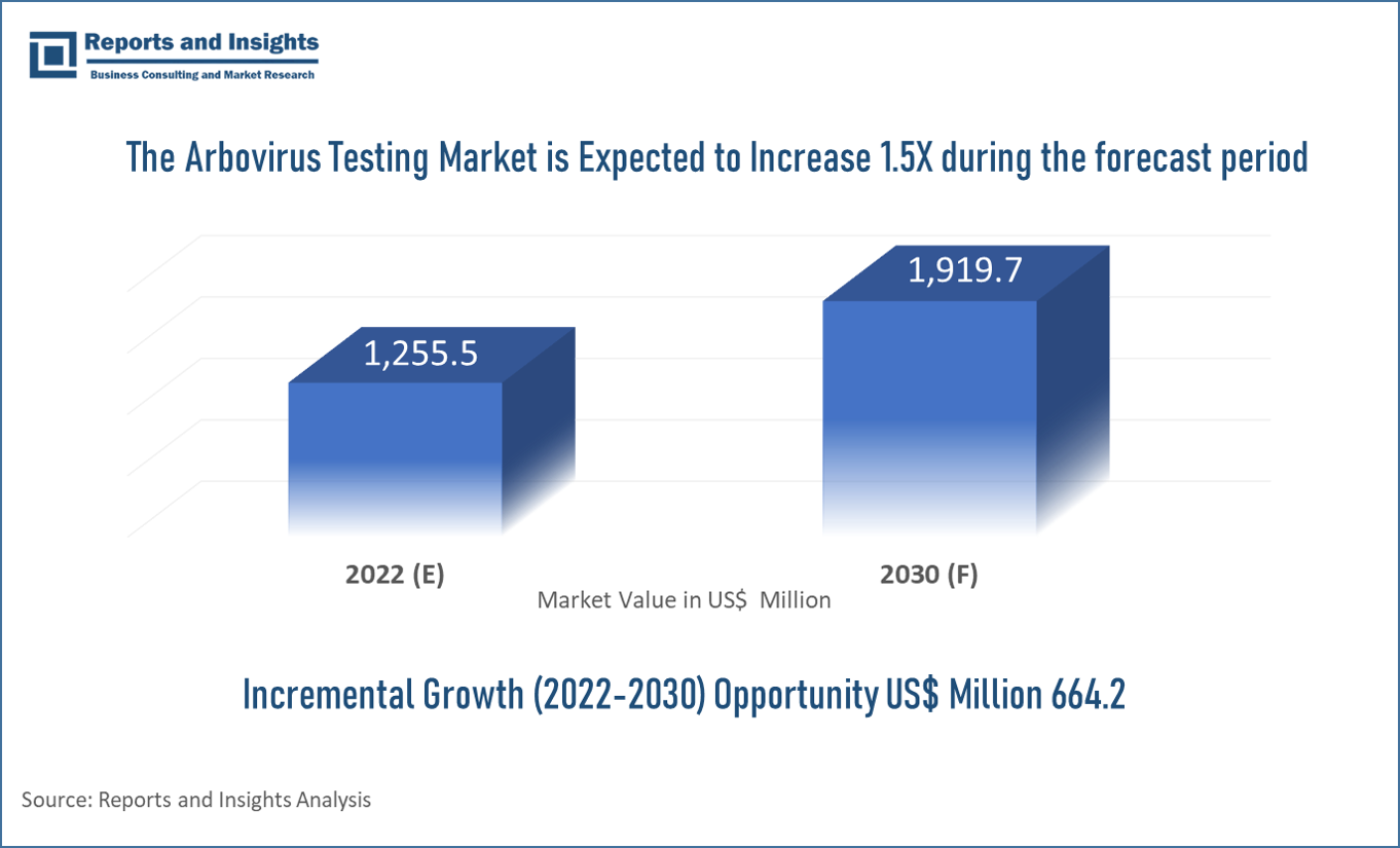 Brooklyn, New York, Oct. 07, 2022 (GLOBE NEWSWIRE) -- Reports and Insights (R&I) has published a new report titled, “Arbovirus Testing Market: Opportunity Analysis and Future Assessment 2022-2030” analyzed By Type (Antibody Tests, Nucleic Acid Amplification Testing), By End-User (Diagnostic Laboratories, Hospitals, Research Centers, Others), and By Region (North America, Europe, Asia Pacific, Latin America, Middle East, & Africa) is estimated to reach at a value of US$ 1,255.5 Mn by the end of 2022 and expected to reach at a value of US$ 1,919.7 Mn by 2030 with a significant CAGR of 5.4%