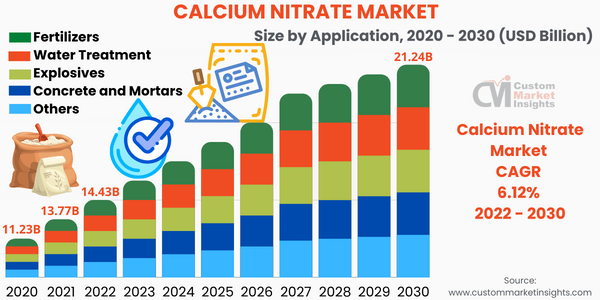 Sandy, Utah, USA, Oct. 17, 2022 (GLOBE NEWSWIRE) -- Custom Market Insights has published a new research report titled “Calcium Nitrate Market Size, Trends and Insights by Application (Fertilizers, Water Treatment, Explosives, Concrete and Mortars, Others), By Method (Limestone, Ammonium Nitrate, Phosphate Rock), and By Region - Global Industry Overview, Statistical Data, Competitive Analysis, Share, Outlook, and Forecast 2022–2030” in its research database.