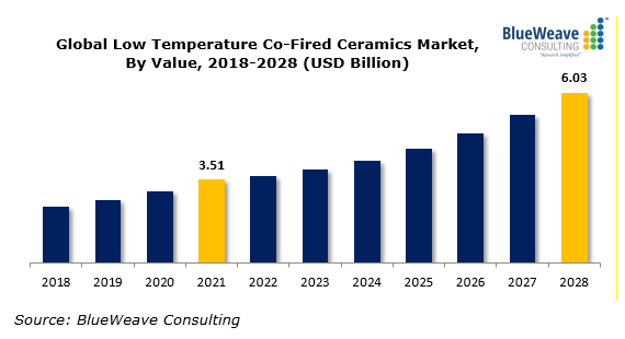 A recent study conducted by the strategic consulting and market research firm, BlueWeave Consulting, revealed that the global low temperature co-fired ceramics market was worth USD 3.51 billion in the year 2021. The market is projected to grow at a CAGR of 8.2% from 2022-2028 (forecast period), earning revenues of around USD 6.03 billion by the end of 2028. Global low temperature co-fired ceramics market is booming because of the rise of the consumer goods industry, the spread of metropolitan areas, and the present trend toward smaller electronic devices. The rising popularity of Light Emitting Diodes (LEDs) has contributed to the expansion of the global low temperature co-fired ceramics market in recent years. This has increased demand for low temperature co-fired ceramics.