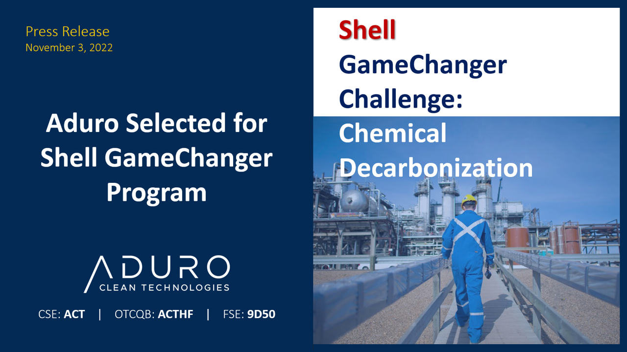 SARNIA, Ontario, Nov. 03, 2022 (GLOBE NEWSWIRE) -- Aduro Clean Technologies Inc. (“Aduro” o la “Empresa”) (CSE: ACT) (OTCQB: ACTHF) (FSE: 9D50), un desarrollador canadiense de tecnologías patentadas a base de agua para el reciclaje químico de plásticos y transformación de crudo pesado y aceites renovables en recursos de nueva era y combustibles de mayor valor, anuncia la exitosa selección y aceptación al programa Shell GameChanger.