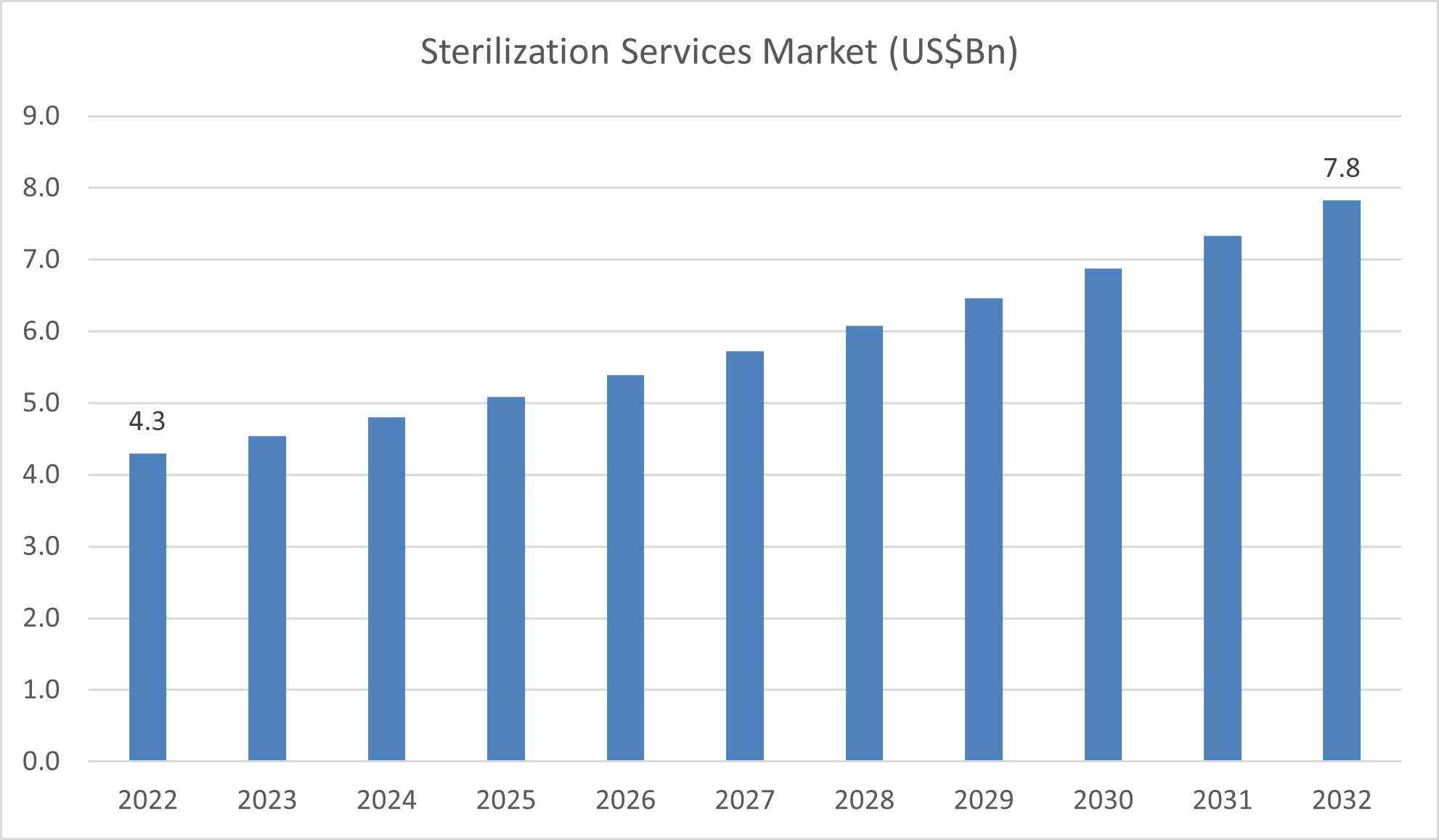 Sterilization Services Market accounted for US$ 4.3 billion in 2022 and is estimated to be US$ 7.8 billion by 2032 and is anticipated to register a CAGR of 8.6% - By PMI