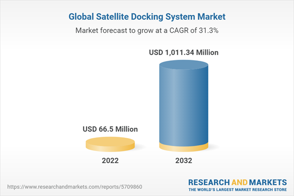 The global satellite docking system market is estimated to reach $1,011.34 million in 2032 from $66.5 million in 2022, at a growth rate of 31.3% during the forecast period 2022-2032.