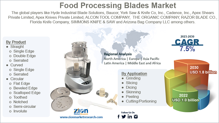 NEW YORK, United States, April 18, 2023 (GLOBE NEWSWIRE) -- Zion Market Research has published a new research report titled “Food Processing Blades Market By Product (Straight, Curved, And Circular), By Application (Grinding, Slicing, Dicing, Skinning, Peeling, And Cutting/Portioning), And By Region - Global And Regional Industry Overview, Market Intelligence, Comprehensive Analysis, Historical Data, And Forecasts 2023 – 2030” in its research database.