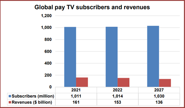 Global pay TV revenues peaked in 2016 at $199 billion. Revenues will fall to $125 billion in 2028 - down from $151 billion in 2022. This comes despite the number of pay TV subscribers remaining at just under 1 billion.