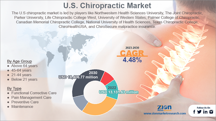 Browse the full “U.S. Chiropractic Market By Age Group (Above 64 years, 45-64 years, 21-44 years, and Below 21 years), By Type (Functional Corrective Care, Pain Management Care, Preventive Care, and Maintenance), and By Region - Regional Industry Overview, Market Intelligence, Comprehensive Analysis, Historical Data, and Forecasts 2023 – 2030”-Report at https://www.zionmarketresearch.com/report/chiropractic-market