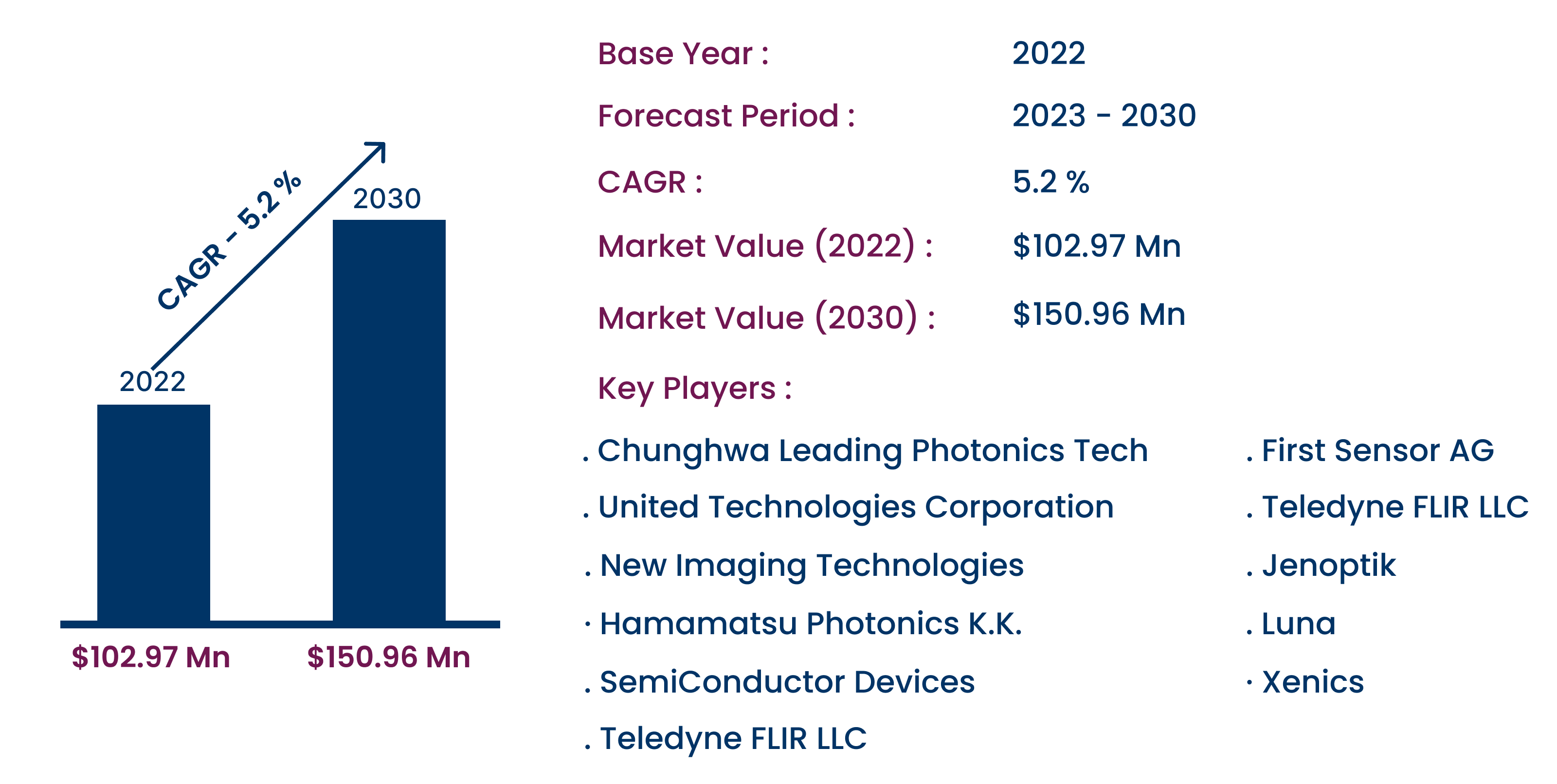 | Key Players | Chunghwa Leading Photonics Tech, First Sensor AG, Hamamatsu Photonics K.K., Jenoptik, Luna, New Imaging Technologies, SemiConductor Devices, Sofradir Group, Teledyne FLIR LLC, United Technologies Corporation, Xenics |