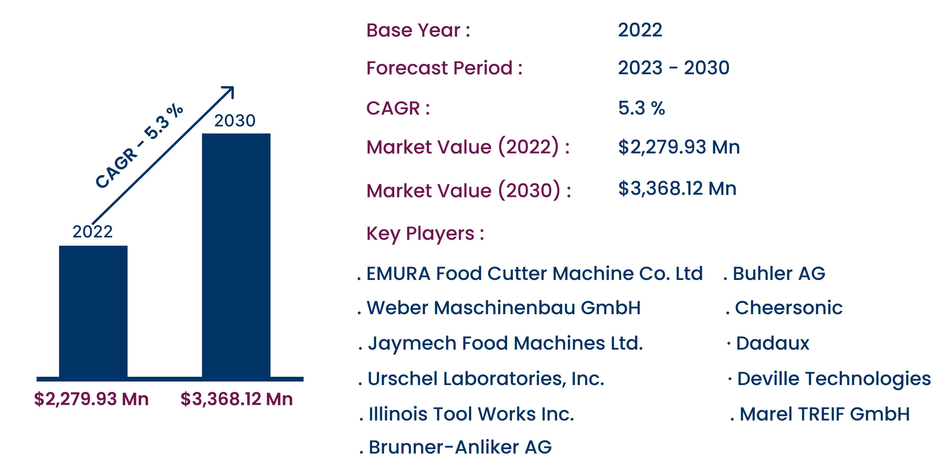 | Key Players | Brunner-Anliker AG, Buhler AG, Cheersonic, Dadaux, Deville Technologies, EMURA Food Cutter Machine Co. Ltd, Illinois Tool Works Inc., Jaymech Food Machines Ltd., Marel TREIF GmbH, Urschel Laboratories, Inc., Weber Maschinenbau GmbH |