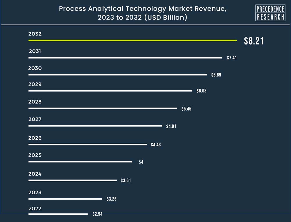 Ottawa, June 05, 2023 (GLOBE NEWSWIRE) -- As per Precedence Research, the global process analytical technology market size was valued at USD 2.94 billion in 2022. Process Analytical Technology (PAT) is a system of methods and tools used in the manufacturing industry to monitor and control the manufacturing process in real time. It involves using advanced analytical techniques to measure key process parameters and ensure that the manufacturing process is operating within the desired range.