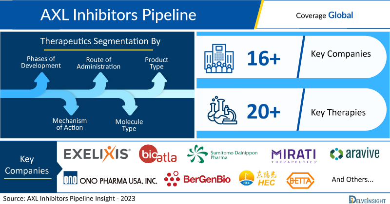 - DelveInsight’s AXL inhibitors pipeline report depicts a robust space with 16+ active players working to develop 20+ pipeline AXL inhibitors.