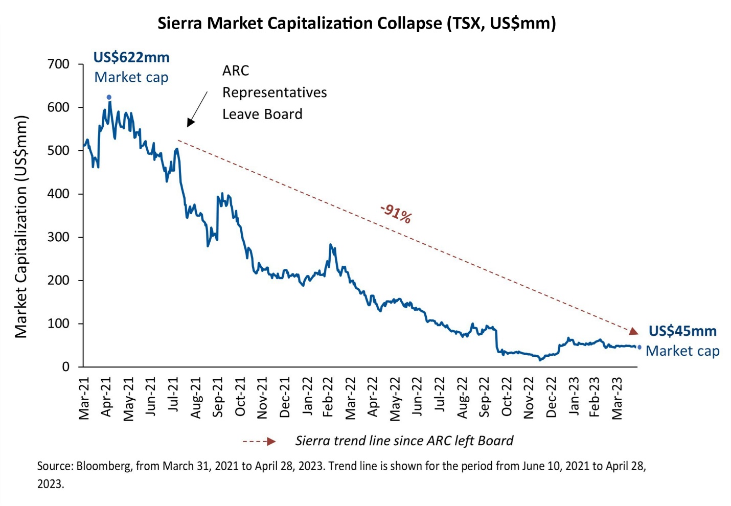ARC believes that shareholders should reconstitute the Sierra Board by electing the ARC Nominees, who have the right mix of skills and prior experience in turning around the Company. When ARC representatives previously served on the Board, Sierra shareholders saw returns of 93.12% in 2020 and 188.33% cumulative (9.64% annualized) from 2010 until mid-2021. The Company’s market cap grew to more than US$600 million in Q2 2021 when ARC representatives were on the Board compared to the current market cap of below US$50 million.