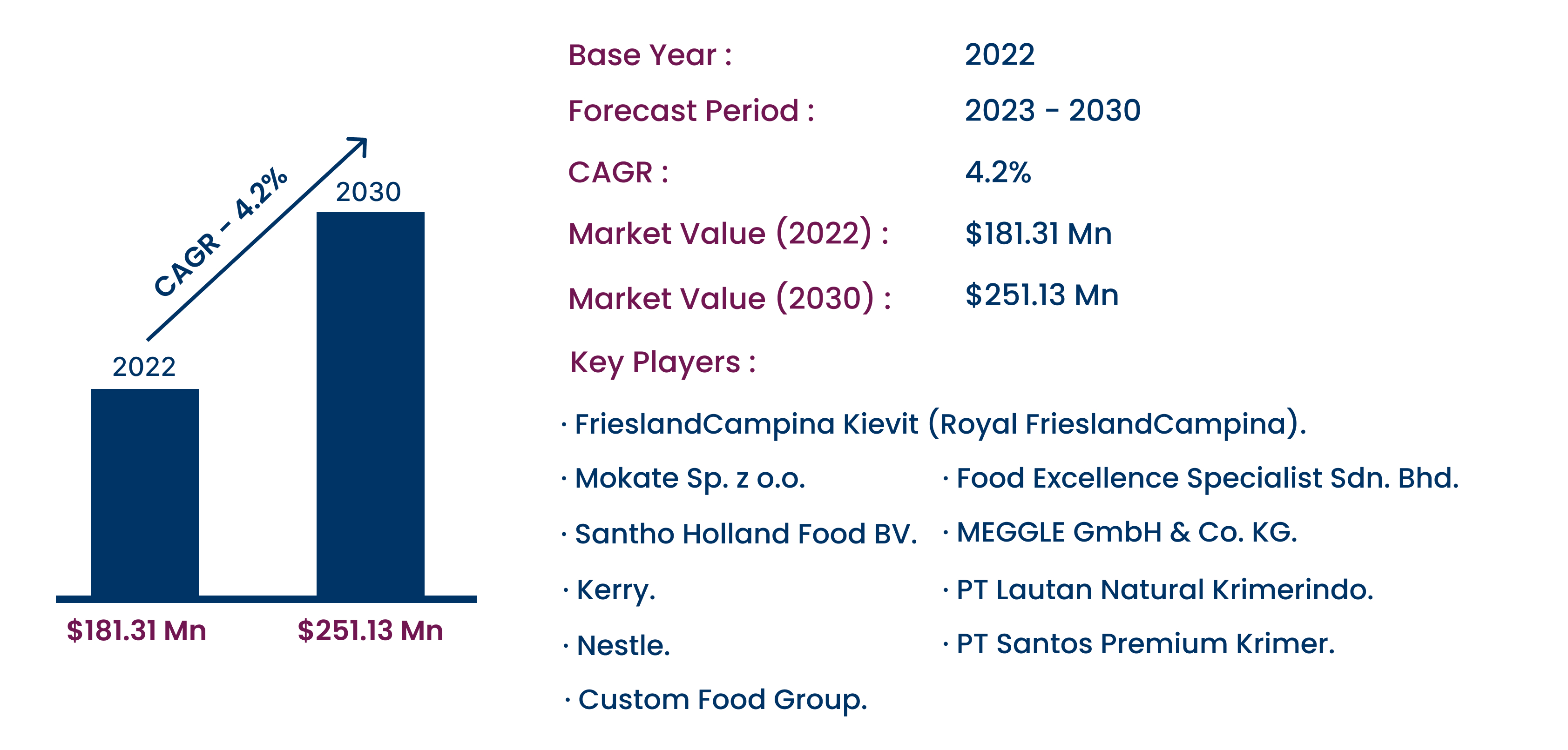 | Key Players | FrieslandCampina Kievit (Royal FrieslandCampina), Kerry, Mokate Sp. z o.o., MEGGLE GmbH & Co. KG, Santho Holland Food BV, Custom Food Group, PT Lautan Natural Krimerindo, Food Excellence Specialist Sdn. Bhd., PT Santos Premium Krimer, and Nestle |