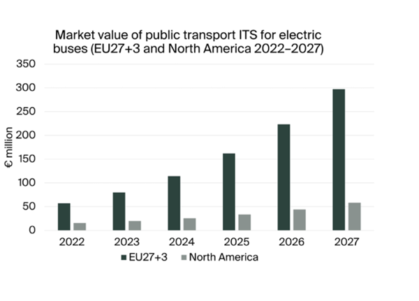 The market value for electric bus ITS deployed in European public transport operations was €57.1 million in 2022. Growing at a compound annual growth rate (CAGR) of 39%, this number is expected to reach €297.2 million by 2027. The North American market for electric bus ITS is similarly forecasted to grow at a CAGR of 30% from €15.5 million in 2022 to reach € 58.2 million in 2027.