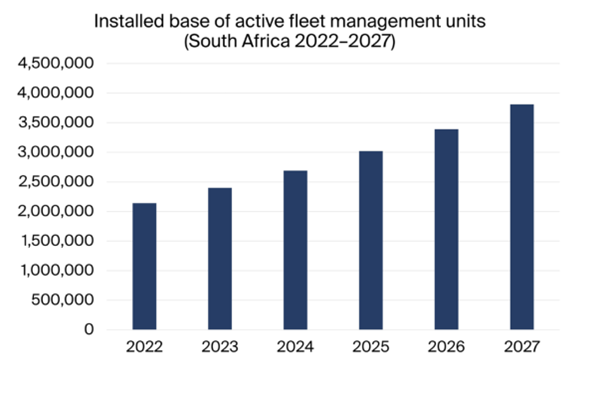 The number of active fleet management systems deployed in commercial vehicle fleets in South Africa reached an estimated 2.1 million in Q4-2022. Growing at a compound annual growth rate (CAGR) of 12.2 percent, this number is expected to reach 3.8 million by 2027.