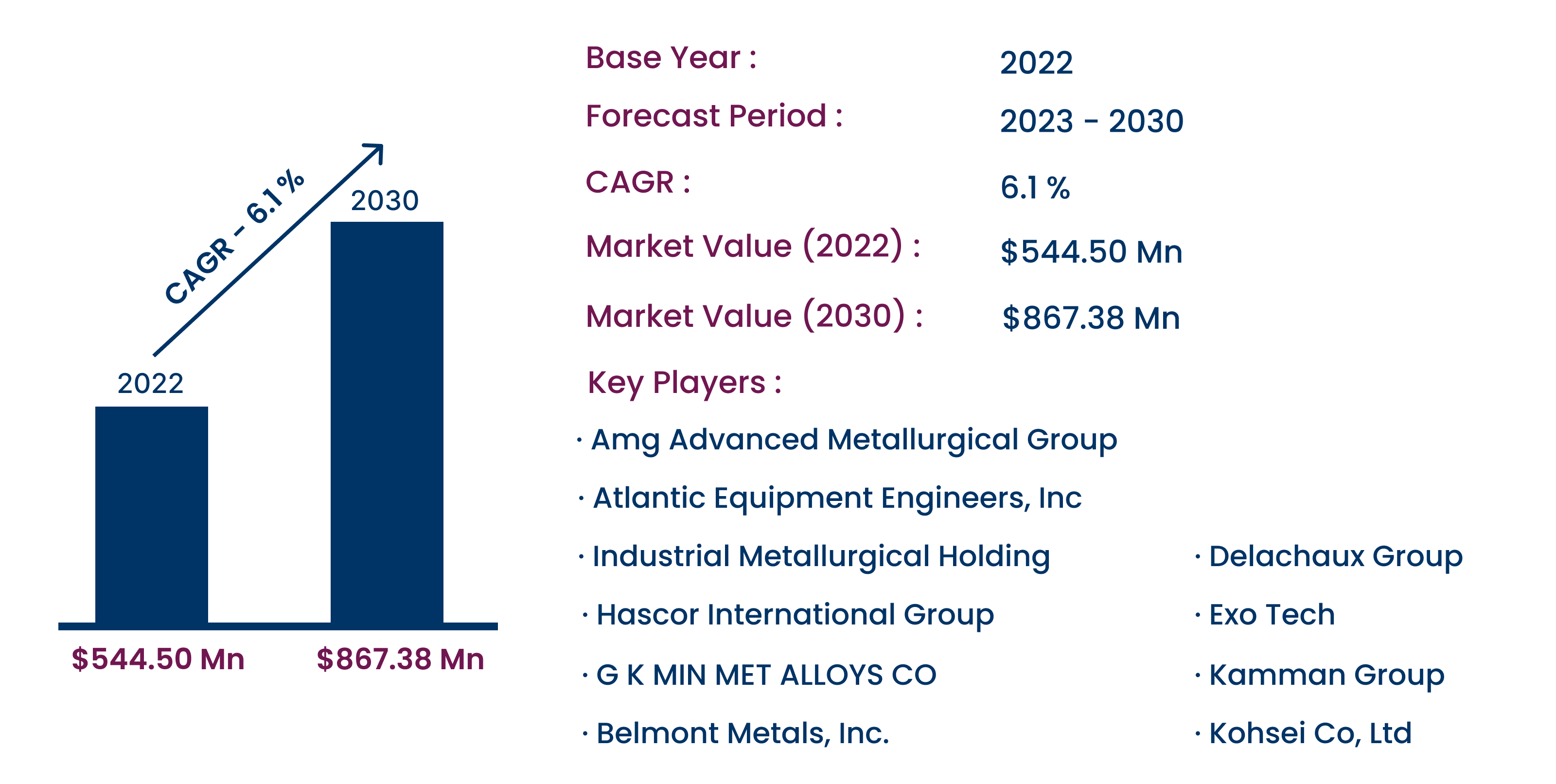 | Key Players | Amg Advanced Metallurgical Group, Delachaux Group, Exo Tech, Hascor International Group, Industrial Metallurgical Holding, Kohsei Co, Ltd, Atlantic Equipment Engineers, Inc., Belmont Metals, Inc., Kamman Group, and G K MIN MET ALLOYS CO |