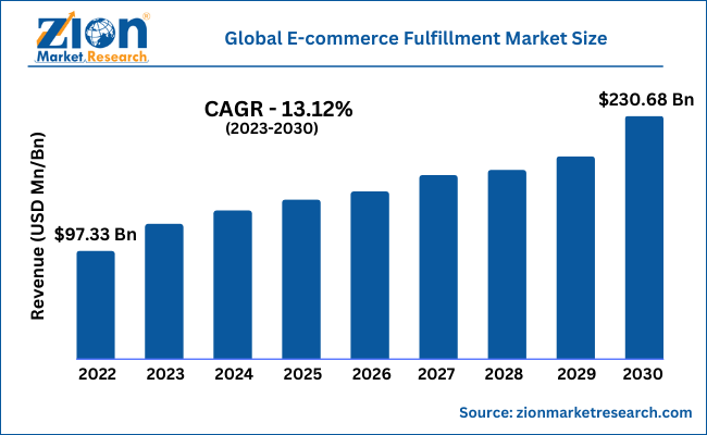NEW YORK, United States, July 20, 2023 (GLOBE NEWSWIRE) -- Zion Market Research has published a new research report titled “E-Commerce Fulfillment Market: Global Industry Analysis, Size, Share, Growth, Trends, And Forecast, 2023 - 2030” in its research database. According to the latest research study, the global E-Commerce Fulfillment Market size was worth at around USD 97.33 billion in 2022. The market is expected to grow above a CAGR of 13.12% and is anticipated to reach over USD 230.68 billion by 2030.