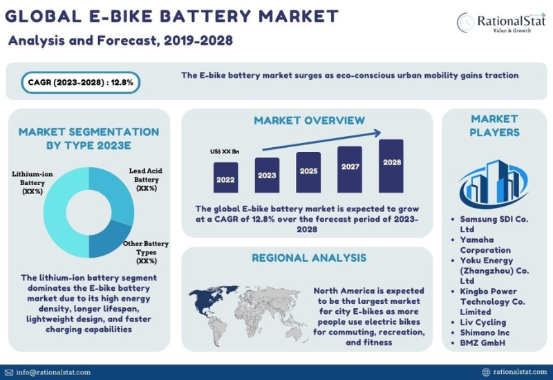 Wilmington, Delaware, Aug. 17, 2023 (GLOBE NEWSWIRE) -- According to a deep-dive market assessment by RationalStat, the Global E-bike Battery Market has been analyzed on the basis of market segments, including type, battery pack position, motor type, and geography/regions (incl. North America, Latin America, Western Europe, Eastern Europe, Middle East & Africa, and Asia Pacific). The report also offers global and regional market sizing for the historical period of 2019-2022 and the forecast period of 2023-2028.