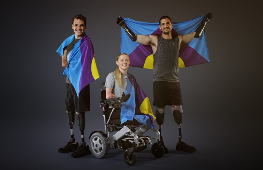 From left to right: para-athletes Théo Curin (France), Ellie Challis (Great Britain), Davide Morana (Italy). All live and compete internationally with the consequences of meningitis.