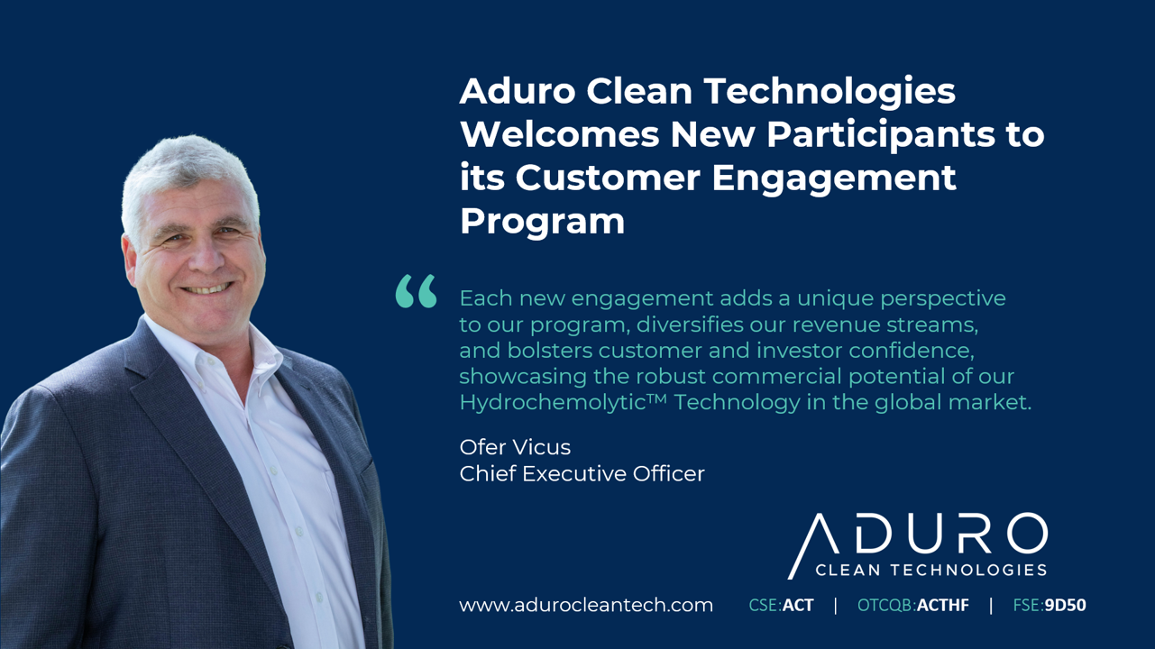 SARNIA, Ontario, Oct. 12, 2023 (GLOBE NEWSWIRE) -- Aduro Clean Technologies Inc. („Aduro“ oder das „Unternehmen“) (CSE: ACT) (OTCQB: ACTHF) (FSE: 9D50), ein kanadisches Technologieunternehmen, das die Kraft der Chemie nutzt, um minderwertige Ausgangsmaterialien wie z. B. Kunststoffabfälle, schweres Bitumen und erneuerbare Öle in Ressourcen für das 21. Jahrhundert zu verwandeln, freut sich, bekanntgeben zu können, dass zwei neue Mitglieder in das Customer Engagement Program („CEP“) aufgenommen wurden.