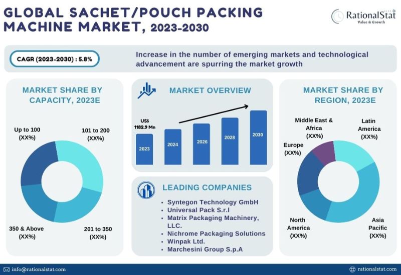 - According to a deep-dive market assessment by RationalStat, the global Sachet/Pouch Packing Machine market has been analyzed on the basis of market segments, including capacity, product type, application, machine lane, end use and geography/regions (including North America, Latin America, Western Europe, Eastern Europe, Middle East & Africa, and Asia Pacific). The report also offers global and regional market sizing for the historical period of 2019-2022 and the forecast period of 2023-2030.