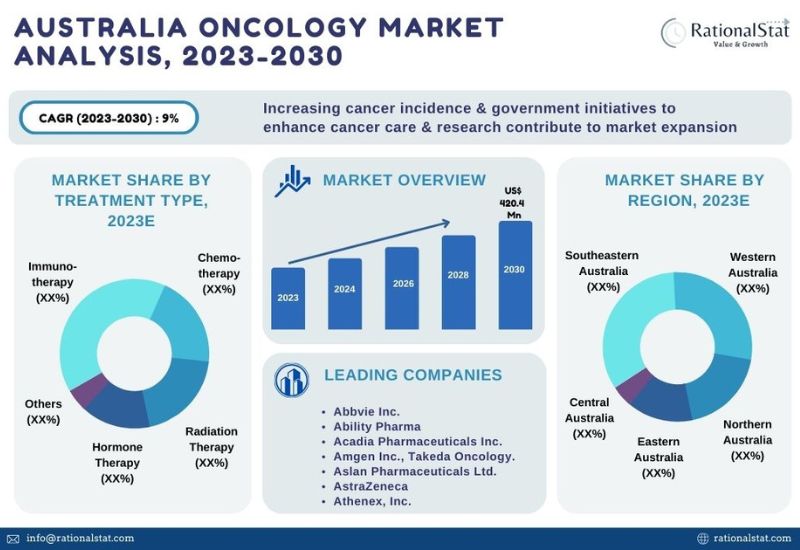 - According to a deep-dive market assessment by RationalStat, the Australia Oncology market has been analyzed on the basis of market segments, including treatment type, end user and geography/regions (including Western Australia, Southern Australia, Eastern Australia, Northern and Central Australia). The report also offers Australia and regional market sizing for the historical period of 2019-2022 and the forecast period of 2023-2030.