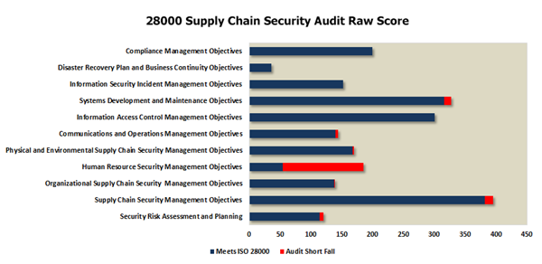 The Security Supply Chain ISO 28000 Audit Program includes 25 full security management job descriptions which define specific roles and responsibilities and 28 electronic forms. The Security Supply Chain Audit Program is easy to use and automatically generates graphics that can be used in management and compliance review presentations.