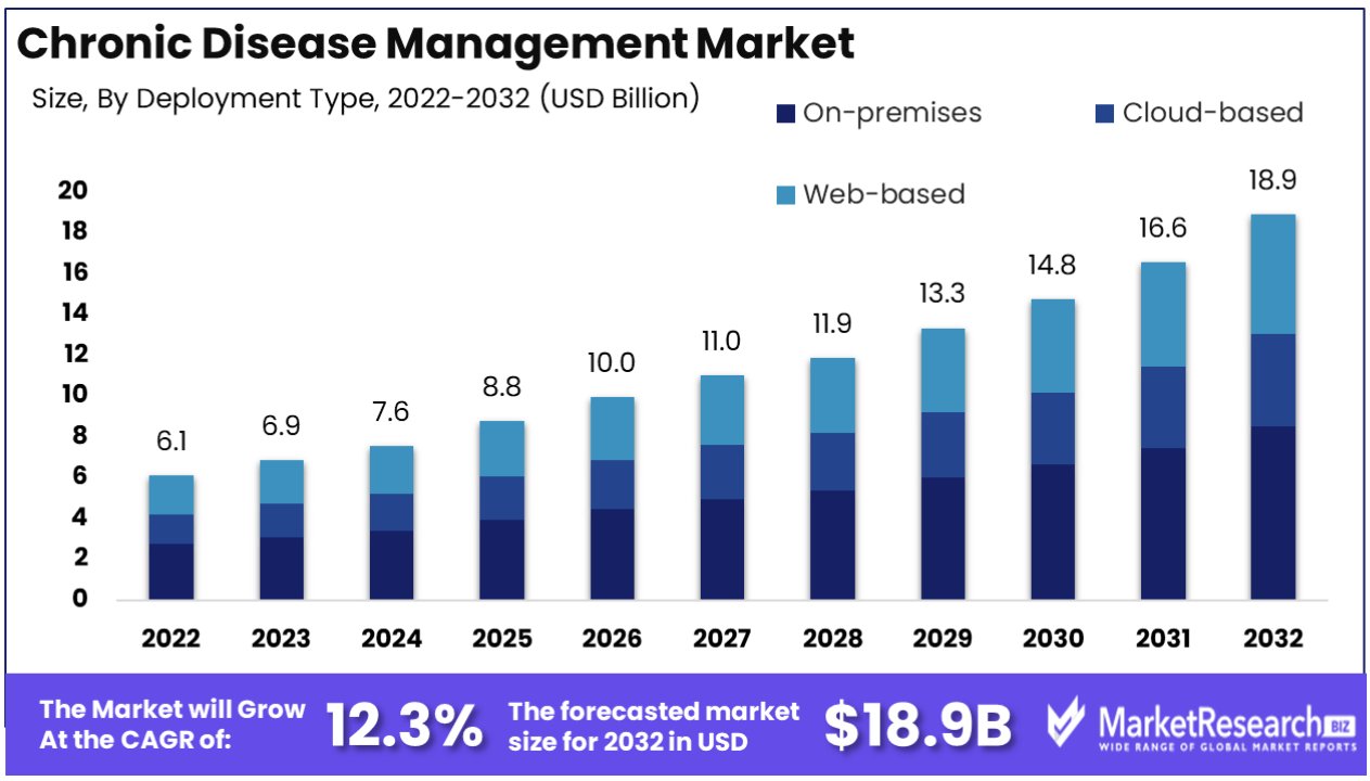 New York, Oct. 31, 2023 (GLOBE NEWSWIRE) -- In 2022, the global chronic disease management market reached USD 6.1 billion, poised for substantial growth and projected to hit USD 18.9 billion by 2032, growing at a CAGR of 12.3%. Chronic disease management represents a patient-centered approach to health care where ongoing care for acute medical conditions is prioritized. This holistic approach includes a variety of interventions, from personalized medication regimens to lifestyle changes, all aimed at relieving symptoms and preventing complications. Through effort, not only does it increase patient satisfaction, but it also helps to reduce unnecessary hospitalizations and overall healthcare costs. Worldwide, the important role of chronic diseases is increasingly recognized.