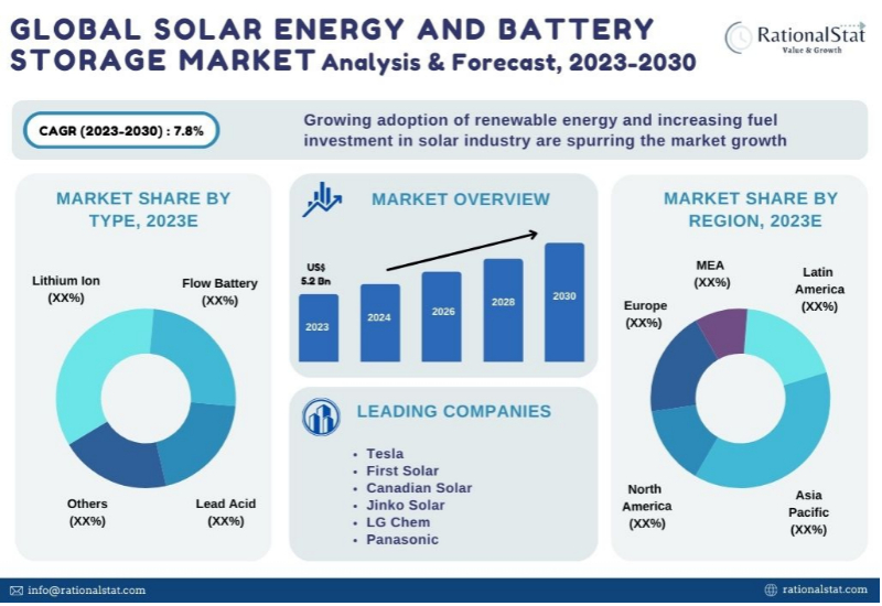 Wilmington, delaware, Nov. 29, 2023 (GLOBE NEWSWIRE) -- According to RationalStat’s most recent industry analysis, the Global Solar Energy and Battery Storage Market value is assessed at US$ 5.2 billion in 2023 and is expected to rise at a strong CAGR of over 7.8% over the forecast period of 2023-2030.