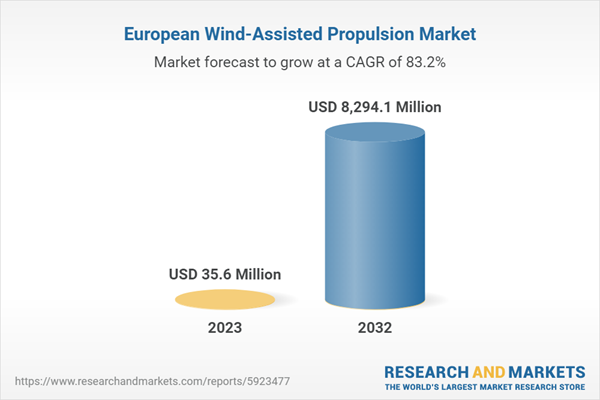 The Europe wind-assisted propulsion market (excluding U.K.) is projected to reach $8.29 billion by 2032 from $35.6 million in 2023, growing at a CAGR of 83.22% during the forecast period 2023-2032. Wind-assisted propulsion is listed as a "energy harvesting" technique in energy efficiency indexes due to its use of wind to directly increase thrust. Nonetheless, operational costs are still vulnerable to weather-related fluctuations. However, the benefits of sailing can be enhanced by using weather routing algorithms, which can chart ideal routes tailored to specific vessels. Nonetheless, widespread adoption of wind-assisted propulsion systems (WAPSs) confronts significant challenges, including the critical need for reliable and efficient technologies that can operate well in a variety of weather circumstances.