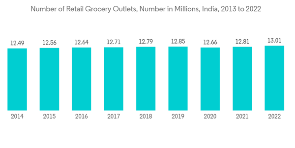 - According to Global Agriculture Information Network, in 2022, there were around 13 million retail grocery stores in India. Within the category, this encompassed traditional and new retailers. While there has been a constant growth in numbers since 2013, it primarily comprises traditional stores. The rise in the retail stores would increase the demand for the studied market, and the retailers may send the product discount rate and any seasonal sales through messages.