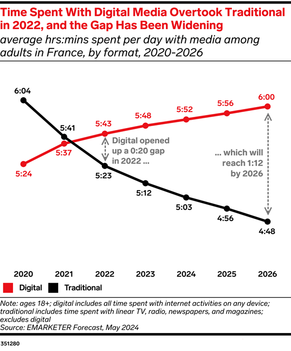 • Time Spent With Digital Media Overtook Traditional in 2022, and the Gap Has Been Widening (average hrs:mins spent per day with media among adults in France, by format, 2020-2026)