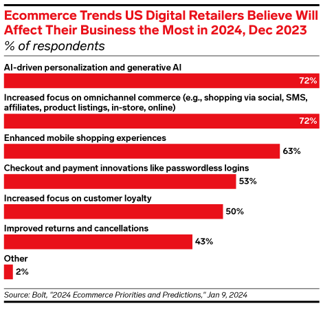 Key Stat: Over 70% of US digital retailers believe AI-driven personalization and genAI will affect their business in 2024, according to a December 2023 survey by Bolt - making hyper-personalization as important as omnichannel.