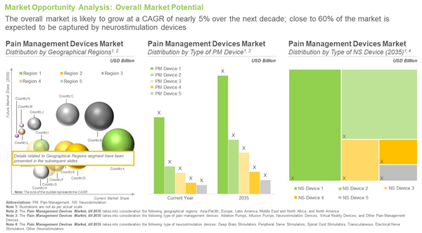 - A detailed estimate of the current market size, opportunity and the future growth potential for pain management devices, over the next decade. Based on multiple parameters, likely adoption trends and through secondary research, we have provided an informed estimate on the market evolution during the forecast period, till 2035. The report also features the likely distribution of the current and forecasted opportunity. Further, in order to account for future uncertainties and to add robustness to our model, we have provided three forecast scenarios, namely conservative, base and optimistic scenarios, representing different tracks of the industry's growth.