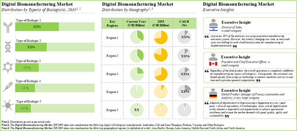 Considering the current market trends and innovation, it is anticipated that the next generation of machine learning technologies will be integrated with advanced data analytics, and process and equipment modeling to form comprehensive systems, for the purpose of real-time monitoring and predictive analysis. Driven by the increasing number of biologics approved, consequent growth in the number of biologics-focused clinical trials, rise in R&D activity and rising popularity of cloud and IoT based process technologies, the digital biomanufacturing industry is expected to witness steady growth over the coming years.