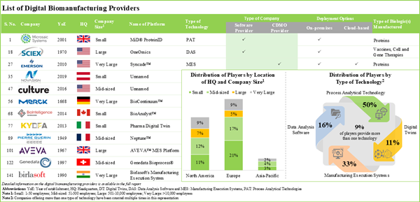 - Currently, over 100 firms claim to offer a variety of novel digital biomanufacturing solutions in order to cater to the rising demand for biopharmaceuticals.