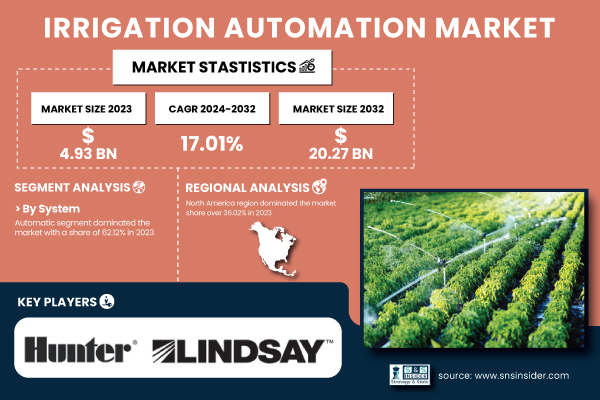 Austin, Feb. 13, 2025 (GLOBE NEWSWIRE) -- The SNS Insider report indicates that the Irrigation Automation Market size was valued at USD 4.93 Billion in 2023 and is expected to grow to USD 20.27 Billion by 2032, growing at a CAGR of 17.01% over the forecast period of 2024-2032. The Irrigation Automation Market is experiencing significant growth due to the growing need for efficient water management solutions in agriculture, driven by global water scarcity issues and the increasing demand for precision farming practices.