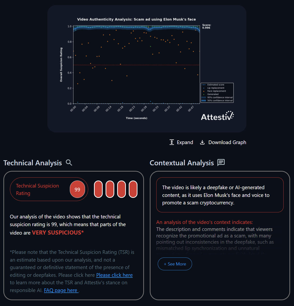 The threat landscape for AI-powered deepfakes continues to expand, rising 700% in 2023. Cybercriminals use generative AI to create fictitious social media posts for social engineering, spear phishing, and confidence and investment fraud. Cybercriminals are increasingly targeting businesses, creating phony celebrity endorsements or deepfake content to impersonate company executives, law enforcement, and authority figures to commit fraud. The new Context Analysis in Attestiv Video helps quickly assess the validity of any video, providing a summary of authenticity at a glance.