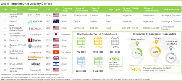 - Presently, around 40 developers are engaged in the development of targeted drug delivery devices for various disorders; of these, more than 50% of players are headquartered in the US alone.