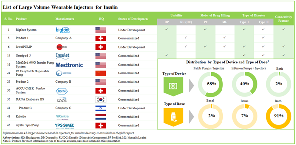 - 45 large volume wearable injectors are being manufactured for insulin delivery by players across the globe; ~60% of these injectors are patch pumps / injectors having the capability to deliver both basal and bolus doses.