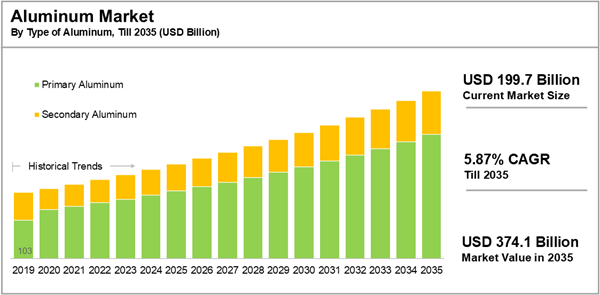 The global aluminum market size is estimated to grow from USD 199.7 billion in the current year to USD 374.1 billion by 2035, at a CAGR of 5.87% during the forecast period, till 2035.