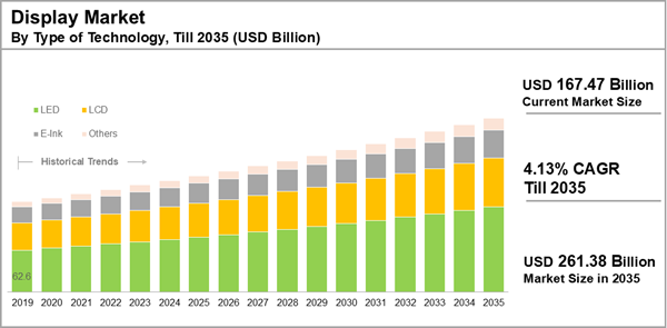 The global display market size is estimated to grow from USD 167.47 billion in the 2025, to USD 261.38 billion by 2035, at a CAGR of 4.13% during the forecast period, till 2035.