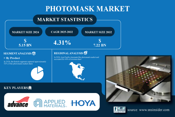 According to the SNS Insider,“The Photomask Market size was valued at USD 5.15 Billion in 2024 and is projected to reach USD 7.22 Billion by 2032, growing at a CAGR of 4.31% during 2025-2032.”