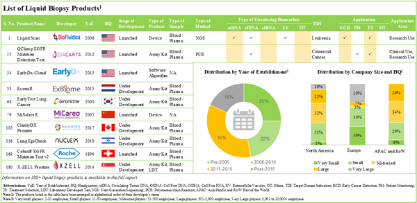- Close to 160 liquid biopsy products comprise of assay kits and laboratory developed tests; of these, ~55% have the capability to detect circulating tumor DNA biomarkers.