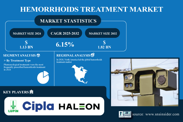 According to SNS Insider, the global Hemorrhoids Treatment Market was valued at USD 1.13 billion in 2024 and is estimated to grow to USD 1.82 billion by 2032, growing at a CAGR of 6.15% during 2025–2032. The U.S. market contributed over USD 340 million in 2024, which is projected to reach USD 520 million by 2032 at 5.33% CAGR.