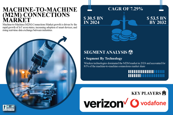 Austin, Sept. 25, 2025 (GLOBE NEWSWIRE) -- The Machine-to-Machine (M2M) Connections Market size was valued at USD 30.5 billion in 2024 and is projected to reach USD 53.5 billion by 2032, expanding at a CAGR of 7.29% during 2025–2032.